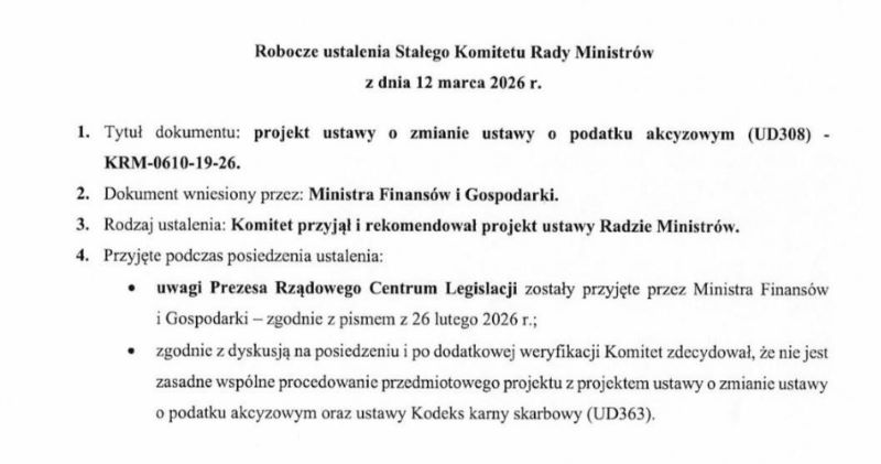 RCL rekomendowało co najmniej sześciomiesięczny okres przejściowy, który umożliwiłby firmom dostosowanie się do nowych wymogów. Ministerstwo Finansów nie uwzględniło jednak tej rekomendacji i utrzymało przyspieszony tryb wprowadzania zmian. Dotarliśmy do pisma z roboczych ustaleń Stałego Komitetu Rady Ministrów, gdzie omawiano ustawę. Oto one: